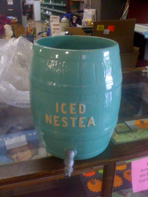 Also in May, we attended a fun golf outing in the North Georgia mountains, where my friend Jinxie and I shopped at a flea market where we spotted a first–headstones! We didn’t purchase one, but later in the day, at a shop in Cleveland, GA., I did buy this awesome (if cracked) vintage Nestea iced tea crock for $18.