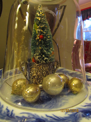 I love looking at vintage Christmas collectibles on blogs and at antique shows, but I only add to my own collections when I find things on the cheap. The thrill of the hunt, you know. And I love arranging everything around the house once the bins have been brought up from the basement. I put on my Sinatra, Crosby and Nat King Cole Christmas CDs, and light an aromatherapy candle and commence to putter. I line up the brush trees, some of them shedding their glitter and rusted branches like their real-life counterpart in the living room, on the shelves of the Welsh cupboard in the dining room.