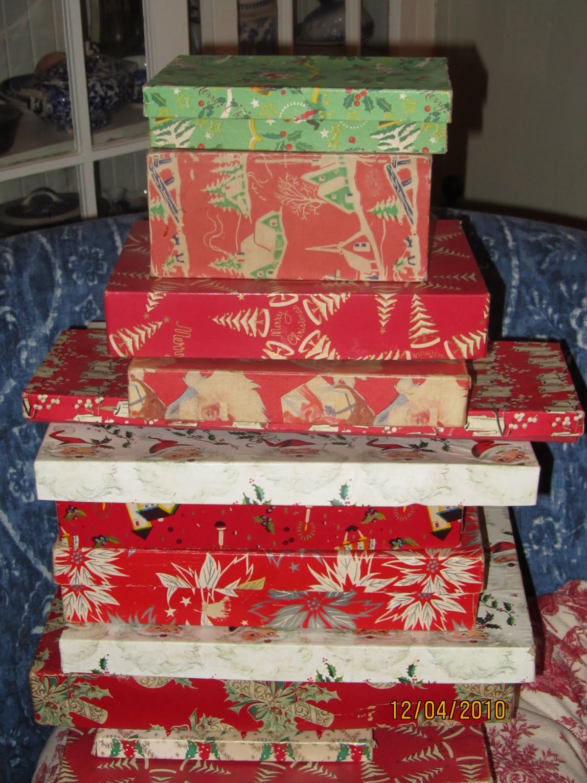 Christmas boxes seated by the fireplace…for now