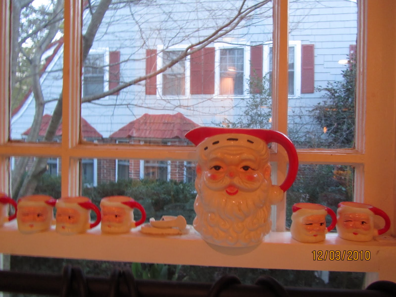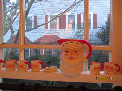 The Santa mug collection got its start because my grandmother had some at her house when I was very young. My sister Susie and I pieced a set together after finding boxes of them at a florist shop. The ones pictured here are actually tiny nut-cup sized, but I’ve also got the cocoa-sized ones on another windowsill.