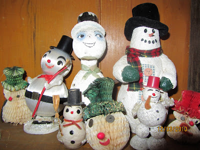 Vintage (mostly) snowmen snuggle up in the secretary.