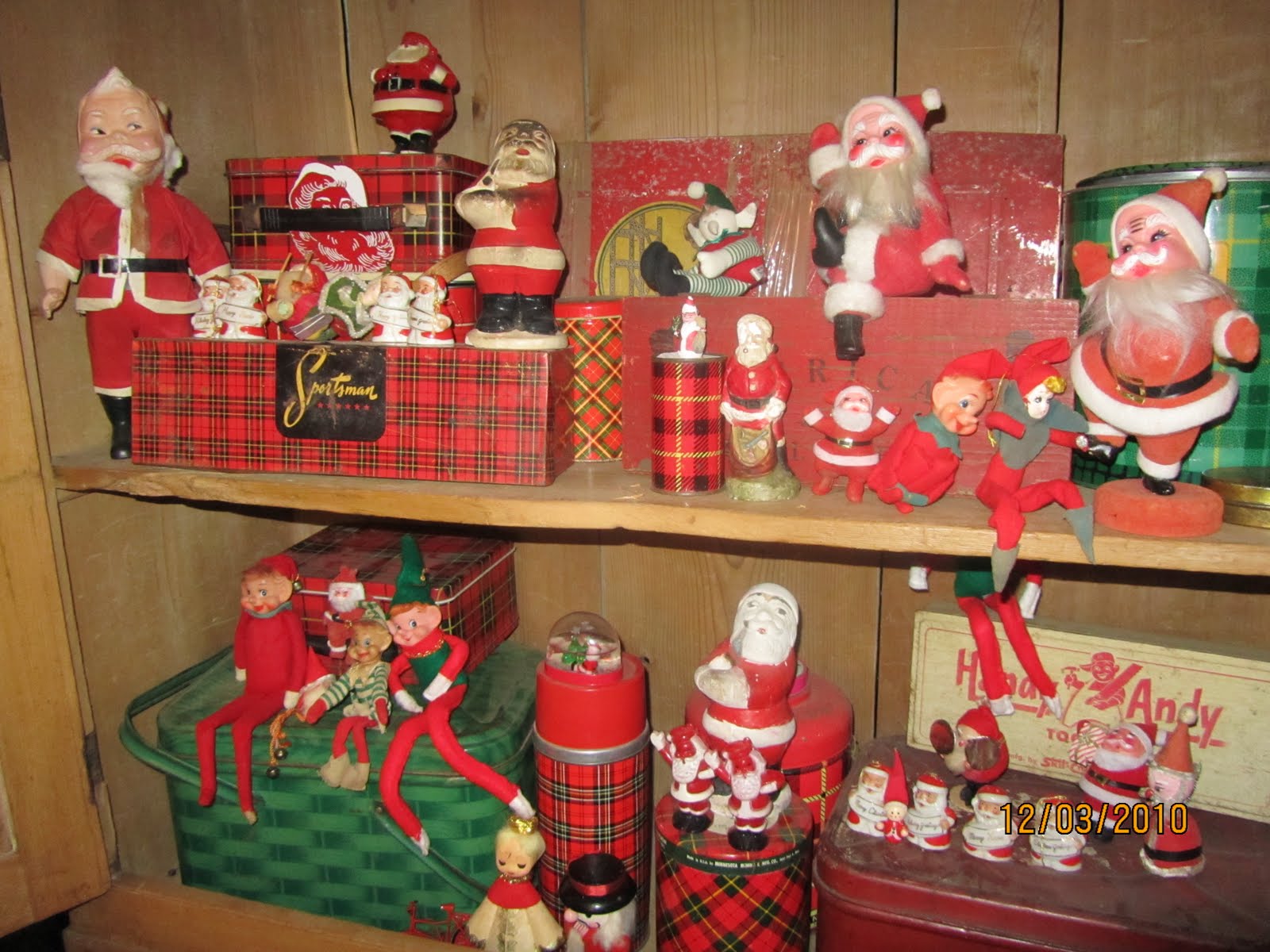Santas and elves congregate on picnic tins and thermoses.