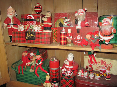 Whew! Did you hear that giant sigh of relief? That was me, happy to have nearly all my Christmas decorating completed. And yes, there are still another half dozen bins of stuff down in the basement. After having two different homes on our neighborhood’s Christmas tour three different times, we (and by we I mean I) have accumulated a lot of holiday decorations. A veritable buttload, my husband would say. When your house is on a Christmas tour, you find yourself putting Christmas trees in the claw-foot tub in your son’s bathroom (2008), and your husband’s office (2008). You find yourself painting your office walls only hours before the tour begins (2000). You sweet-talk your girlfriend and her daughter into wallpapering your bathroom the night before the tour. (1996). And of course, you buy miles of garland and enough lights to string halfway around the world. Why? You rationalize that you are doing this for the betterment of mankind. But really, if you’re me, you can’t not. If you’re me, you fervently believe that anything worth doing is worth overdoing. But this year, we are not, thankfully, on tour. So I’ve simplified. Bwahahahahaha. Who am I kidding? I thought I’d share pix of some of my Christmas collections. Unlike most people, my collections are not numbered, signed, or dated. There is no Christmas Spode in my cupboards, no Christmas villages on a tabletop. Nor are there any artisan-made velvet Santas. I like all these things, but they do not speak to me. What speaks to me are old dime-store decorations. Brush trees from Woolworth’s. Plastic Santa candy containers from Kresge’s. Honeycomb snowmen from stores that haven’t existed since the ’60s. For years and years, I’ve picked up my kitschy little cuties at estate sales and the occasional dealer, especially when I’m junking in the Midwest. Some of my vintage treasures still have their yellowed original price stickers or grease-pencilled prices pencilled on the bottom. Hmm. When was the last time you found anything for 19 cents? Me neither, but these guys remind me of those simpler, cheesier days.