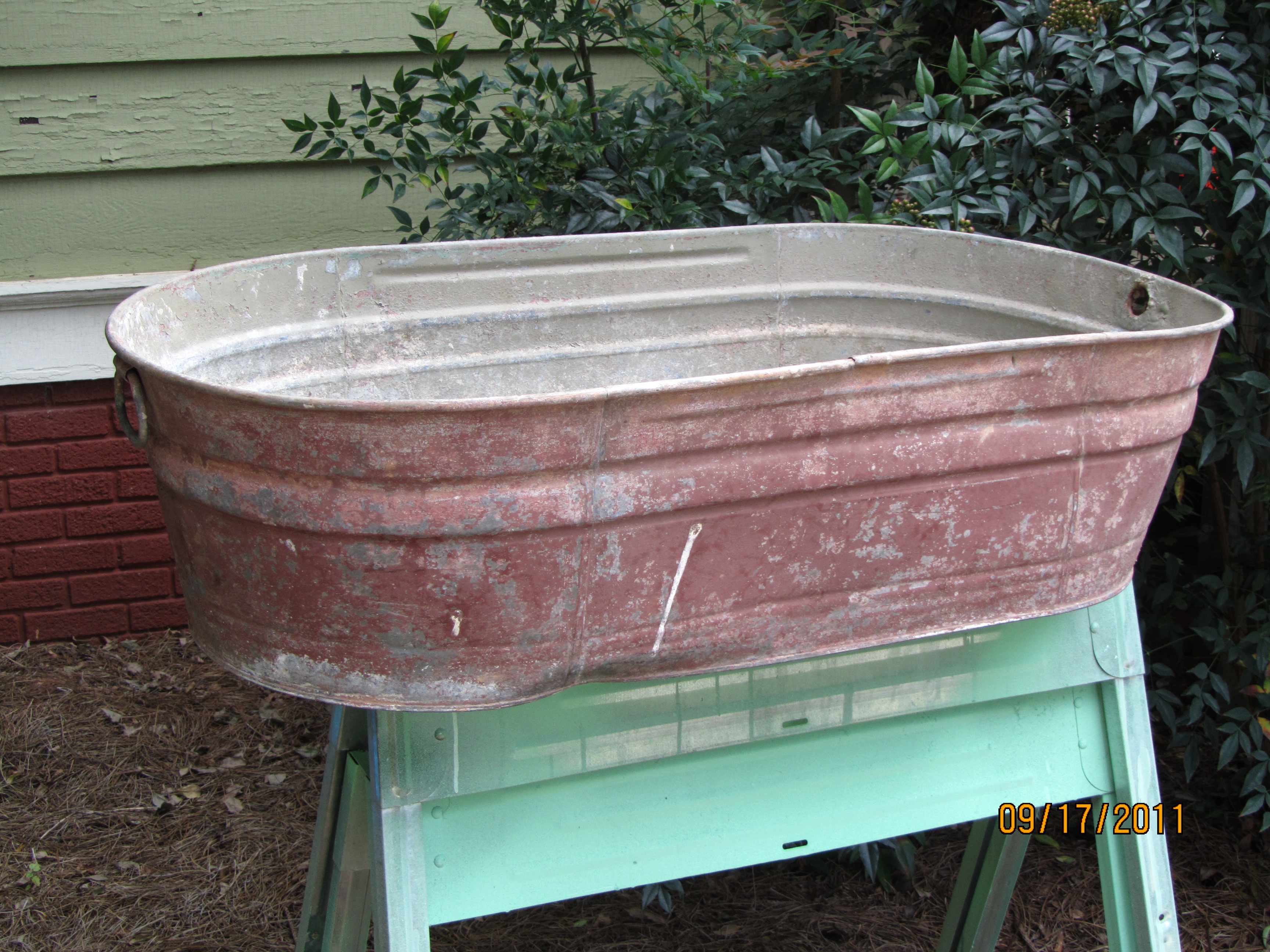 Then we got to the basement. The basement at a Meemaw sale can be very scary. I myself have spotted rat skeletons and unknown vermin poop, not to mention toxic levels of mold, mildew and rot many times in basements.At one Meemaw sale earlier this summer we noticed they had at least a dozen aquariums lined up on wooden benches. With gravel in the aquariums. It gave me a bad feeling and I could not have gotten out of there fast enough. Upstairs, I asked Vicki, the dealer running the show—if the aquariums had been for snakes. “Um, maybe?” Yeah, I was mouth-breathing the whole time! This basement wasn’t so bad. Jinxie pointed out a gigantic galvanized tub with chippy red paint. We got the price–which was less than a Happy Meal, and of course I had to get it.