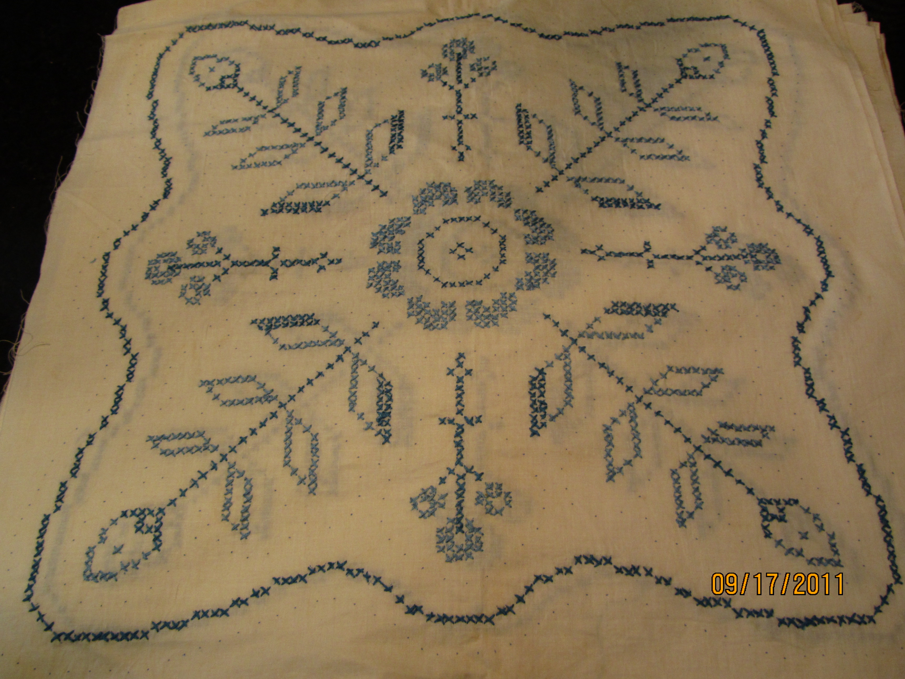 One of the bedrooms had been designated the crafts graveyard. Sewing supplies, knitting supplies, plastic funeral arrangements, a nifty sewing machine and cabinet full of thread and accessories. A sign on the door said every object was $1. Seriously? I found a plastic box full of two different kinds of completed quilt squares. There were 31 completed Vogue-Art cross-stitch squares and 37 of the sunflower appliqued squares. I may just have to try and list these on Etsy or eBay. Score! A big bag full of knitting needles, crochet hooks and yarn. Double score. Do I knit or crochet? Well, no, but I have friends who do, and for a buck a bag, I couldn’t not get them. I also picked up a plaid wool stadium blanket which will be a great addition to the red/green/plaid/fall/camping theme I’mm planning for my booth.