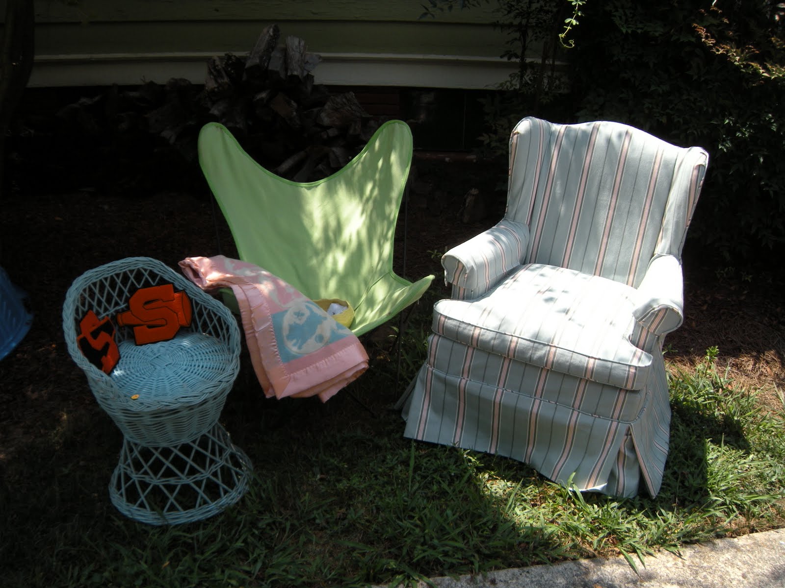 Yes, I know I should have stayed home this morning to finish what my agent and I have come to call TFB–a mysterious acronym for The Friggin’ Book. Only we use a very bad word instead of friggin’. But I stayed home yesterday, ignoring the call of several promising estate sales. And I worked very, very hard all week long, trying to finish revisions of TFB. And I swear, I am this close. But all work and no junking makes MKA a very cranky girl. So posse member Shay and I saddled up and set out this morning for an estate sale in Buckhead, run by Vicki. We love Vicki’s sales, because she gets down to business. Vicki greeted me this morning with the news that she liked the sex scenes in LITTLE BITTY LIES, which she’d just finished reading at the beach, which made us both giggle like naughty school-girls. We traded some more naughty gossip, and then I got down to junking. My first purchase was the little wicker boudoir chair above. Later I found the fun green butterfly chair in the garage. My parents had a pair of those when I was a kid in the ’60s, in a hip orange, so I was happy to find this ‘lil green butterfly, which will join the wicker chair at my booth at Seaside Sisters. I was getting ready to check out when I spotted a trunk which Vicki had just unearthed. Digging around inside, I came up with the adorable plush baby blanket from the ’50s, which is in new condition. And then I found the fun chenille high school letters. Remembering our naughty talk, I suggested that somebody could pin those letters on their sweater and tell everybody they lettered in ‘SLUT’ in high school. Immediately, I realized this is a line I could use in my new book–so you see, junking is a valuable creative outlet for writers. At least that’s what I tell myself. We motored on to another sale, which was a bust, except that it’s always fun to see estate sale ladies like Ann and Dell and Myrtice. And at the last sale of the day, I struck gold with this primo newly slipcovered wing chair. It’s done in great beachy blue stripes and looks like it just came from a showroom. Yay me! If I could find a spot in The Breeze Inn for this lovely, I would, but I think we’ve got a gracious plenty of chairs there, so this puppy will be heading down to my Seaside Sisters booth next weekend. And in the meantime, I’ll have it to “chairish” for at least a week, until I send this and my other treasures off to worthy new homes. Also, now that my creative juices have been re-filled, I’ll just finish TFB.