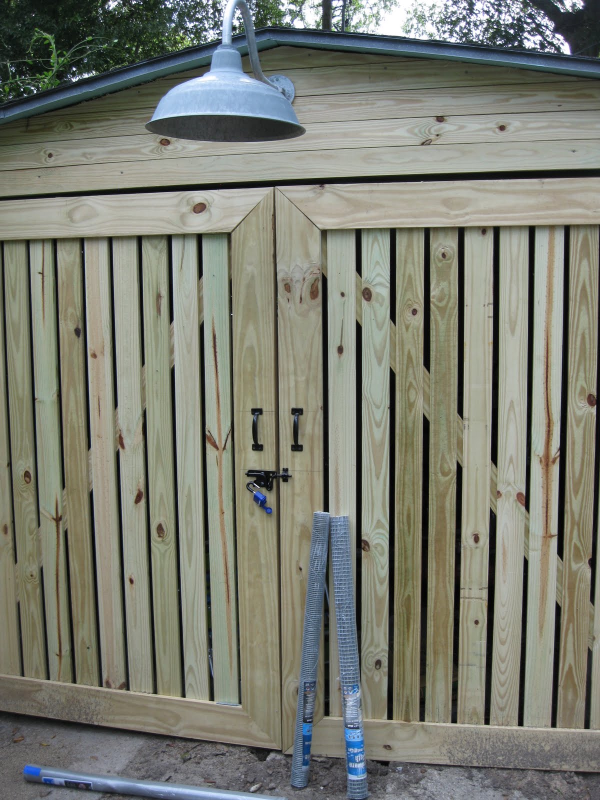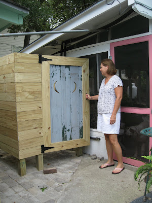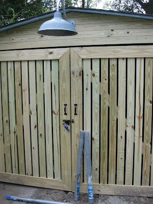 The challenge was to enclose our skanky old carport into a garage, where we can secure our bikes, beach carts, yard tools and yes, my extra junk inventory for my booth at Seaside Sisters. After taking a look around at lots of the original Tybee raised cottages on the island, MMK decided to give our humble garage the same kind of look by enclosing the carport with 1-by-4 vertical boards. He and Joel sunk posts in concrete, then built headers and footers, and screwed down the boards. They even built nifty barn-doors so we can lock up our stuff. Cool, huh?