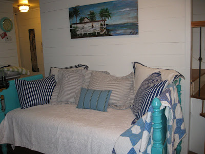 Once the outdoor projects were finished, we decided to play catch-up inside. In the dining room, we hung the two gorgeous bird paintings I bought in Destin while I was on book tour in July, and created a new sleeping area downstairs, moving furniture around and de-cluttering. For the bed there, I bought a pair of beat-up mahogany headboards at the Scott Antique Market for $50 in August. I painted them the same bright turquoise as the hall tree in that same area, and the Mister hooked them up with a pair of salvaged bed rails from our basement in Atlanta. We took a trip into Savannah and bought a nice new pillow-top mattress, and a pair of new feather pillows and mattress pad at Homegoods. And then the fun began. Rummaging around the closets and crannies at The Breeze Inn, I found a perfect white matlesse bedspread from a forgotten yard sale, two huge linen euroshams with a nautical blue piping, a pair of blue and white ticking striped shams, and yet another pair of blue and white quilted shams left-over from the Better Homes and Gardens shoot last summer. Accessorized with a quilt bought at an antique shop in Tennessee last summer, I think the bed looks pretty and inviting. Best of all was the fact that I had all the bed linens pre-hoarded, er, stashed.