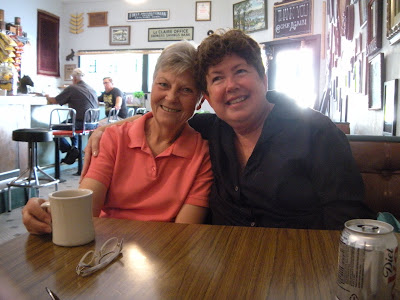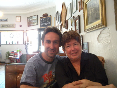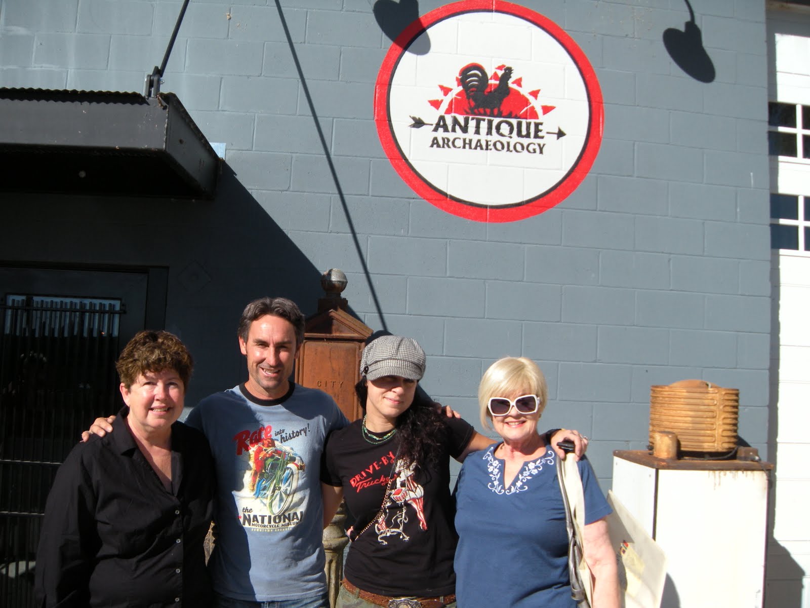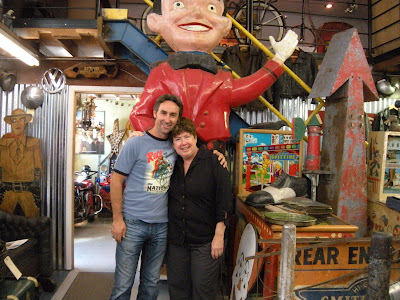 Okay, I admit it. I’m a little bit starstruck. Like five million other Americans, I’ve been watching AMERICAN PICKERS since it began airing on The History Channel last year. I learned about the program from my junk buddy Sue over at Vintage Rescue Squad. Once I saw the show, a little bell rang. I knew this guy. Yeah. When “Savannah Blues” was first published, way back in 2002, I got an email from this guy named Mike Wolfe. He told me he was a picker, and was intrigued that I’d written a novel about an antique picker. We corresponded, and he sent me a short video clip of his picking adventures, explaining that he was trying to sell a show to a cable network. Riiiight, I thought. Like that’s gonna happen. Shows you what I know. It took Mike seven or eight years of hard work, but darned if he didn’t sell a show. And it rocks. When my friend Barb and I set out on our Midwest Junk Junket, starting in Dayton, Ohio this week, Barb pointed out that our eventual destination, Champaign, Illinois, was only a few hours from LeClaire, Iowa, where Antique Archaeology is based. So…we drove to LeClaire. What the heck? I’d never been to Iowa, and maybe we’d run into Mike, the junk hunk. Suuuure. We got to LeClaire at about six Wednesday night, and drove around, trying to locate the shop. It’s a small, gorgeous town, set right on the banks of the Mississippi River. So picturesque, with neat little shops and restaurants downtown. No luck. So we turned a corner, to look for the library, and instead, drove right up to a building with the trademark Antique Archaeology truck parked around back. We got out of our car, decided it must be Mike’s house, but did not want to engage in what my daughter would describe as creepy stalker-girl behavior. We took pictures of ourselves with the truck, and then went to dinner at a restaurant just down the block. Wouldn’t you know it, walking back to our car afterwards, I spotted a familiar-looking guy walking two black dogs down the street. Mike? Mike! We stopped and chatted. He remembered our correspondence, and we agreed to meet for coffee this morning. If you ever get to LeClaire, definitely stop at Pelo’s, which is in a charming old building, run by the third generation owner. Maybe you’ll run into Mike, or at least Mike’s mom, Rita, who is just a total sweetheart. She plays Mrs. Santa Claus for the community children every Christmas. Love her. And Mike–ya gotta love a guy who spends time with his mama, right? And how can you not love a guy who sets up a facebook page for his Border Collie, Ruby? Long story short, we were lucky enough to spend an hour or so with Mike and his Mom. Did not get to meet Frank, darn it. We went to the shop, got to meet Danielle for a skinny minute, before she left to run errands, and best of all, we got to see some of Mike’s favorite picks, up close and personal–the giant Phillip Morris statue, the carnival games, the big red arrow, the Laurel and Hardy heads, ect. Mike’s passion for “rusty gold” is so genuine, so infectious, it’s no wonder his show is a huge hit. He’s like a kid who’s been given the keys to the candy store. And here’s some of what he shared with us: it takes a crew of nine people to shoot the show. They work two weeks on, then two weeks off. California is the next pick–starting in San Diego and working north to San Francisco. Danielle has become such a celebrity, they’ve had to hire three other people just to help clean up and sell their vintage finds, which they actually do sell, either through the shop or on eBay. They get an estimated 10,000 leads for potential picks EVERY WEEK! Mike has bought a shop in downtown Nashville, in an awesome old brick building that used to be an auto plant, and they’ll divide their time between Nashville and LeClaire. We saw pix, and it is going to be amazing, and very accessible to fans who want to visit, buy a T-shirt or an antique bike, and maybe even meet the guys. What else? Oh yeah. They definitely keep up on their tetanus shots.